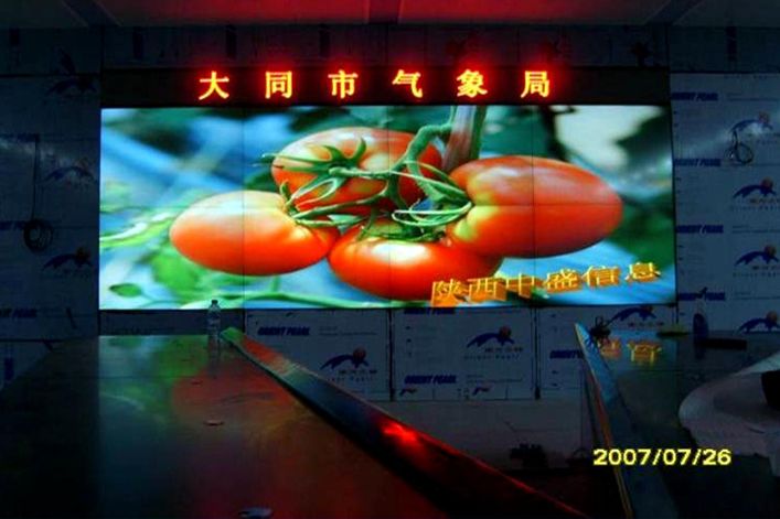 山西省大同市氣象局DLP拼接墻大屏幕顯示系統(tǒng)由陜西中盛信息技術(shù)有限公司承建安裝,項(xiàng)目采用60"的分辨率為1024*768的拼接單元,以2*4的拼接方式安裝完成,為大同市氣象局提供了一個(gè)更好的平臺(tái)來(lái)發(fā)布各種氣象信息。