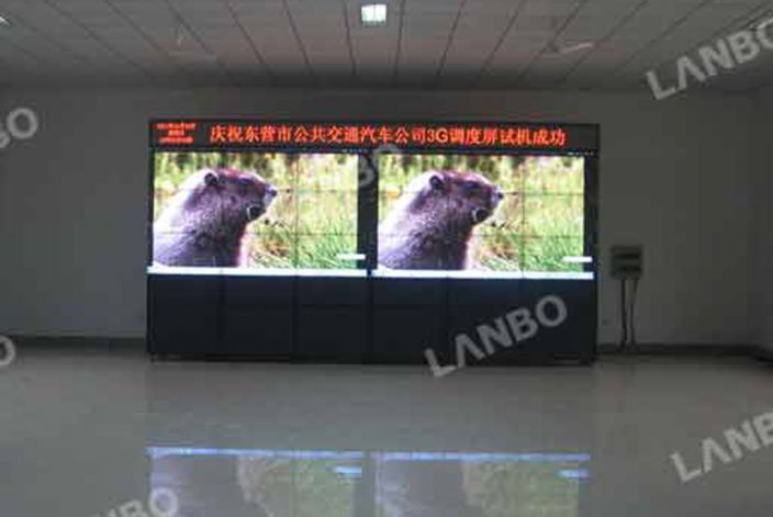 山東東營市公交公司監控室大屏幕顯示系統采用LANBO LCD46寸3×6(顯示尺寸6.156米×1.74米)拼接。可顯示前端操作臺上的任意一臺電腦信號。