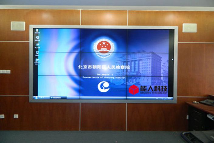 北京市朝陽人民檢察院監控中心液晶拼接墻前端由9臺NEC超窄邊液晶拼接屏X462UN進行3*3的拼接而成,并配有6路視屏輸入和3路PC輸入的拼接控制器,以此實現畫面的組合,疊加,漫游等多種功能。后端配有12進12出的音視屏矩陣,6路視屏信號用以對審訊室的實時監控,3路PC信號用于信息發布。是廣州市能人計算機科技有限公司在政府機關應用的典型案例。