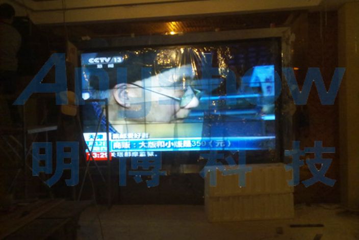 使用一套3*3的46寸超窄邊液晶拼接作為大屏幕顯示。通過電視轉接盒的轉換將中央實事新聞輸入至大屏上,進行實事新聞的學習、研究、討論。