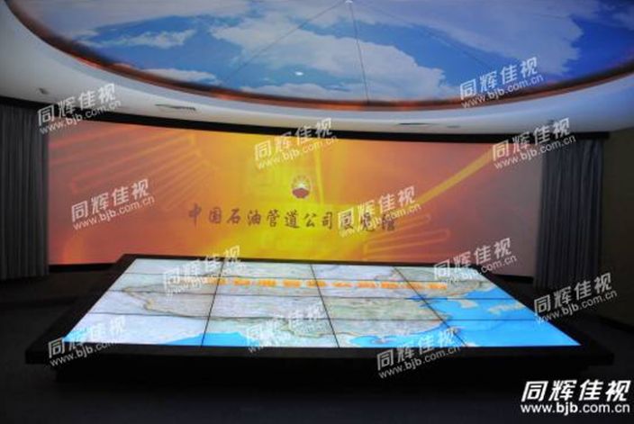 同輝佳視承建的中國石油管道公司LCD液晶拼接屏顯示系統,采用NEC 46寸超窄邊LCD液晶拼接顯示器及4*4拼接方案,單體邊框2.4mm,拼接后的邊框僅為6.7mm,構建了一個效果震撼,色彩絢麗的超級屏幕。同時為了解決屏幕平放,觀眾需要俯視的問題,同輝佳視創造性的設計了30°角斜面拼接的方式,改變觀眾視線與屏的夾角,讓觀眾以一種自然輕松的方式觀看屏幕的內容。