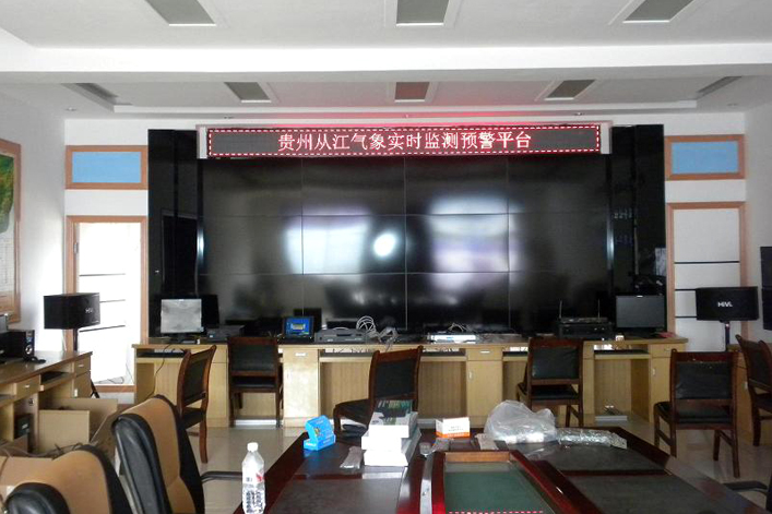 貴州省從江縣氣象局經過多方比對考核,采用了華彩視訊的46寸超窄邊3*4液晶拼接電視墻,配合一套64進12出的視頻矩陣,可以將氣象局及周邊的監控攝像機任意切換上電視墻,一套8進16出的VGA矩陣將氣象局的氣象資料實時在大屏幕上顯示,本套液晶拼接電視墻系統操作簡單方便,穩定性極高,極大方便了從江縣氣象部門的日常氣象工作和安保監控。