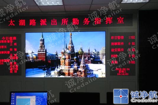 此次為太湖路派出所勤務指揮室打造的2x2的46寸高亮液晶拼接屏,拼接僅為5.5mm,采用高分辨率(1920×1080)、高亮度(700cd/m2)、高對比度(3500:1)、寬視角(178度)的高清DID液晶LED顯示面板。為了能夠高效的處置各類應急突發事件, 越來越多的公安系統選用了液晶拼接領導企業誠凈航提供的液晶拼接大屏顯示系統。