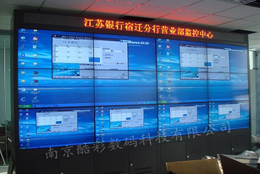 江蘇銀行宿遷分行監(jiān)控中心采用南京酷彩數(shù)碼科技有限公司提供的46寸3*4液晶拼接系統(tǒng),用于銀行的日常監(jiān)控。
