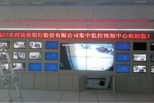 山東龍口商業(yè)銀行監(jiān)控中心液晶拼接墻,采用2*2方式拼接,用于銀行的日常監(jiān)控。