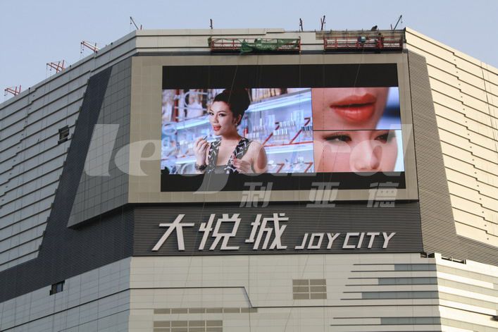 “上海大悅城戶外全彩LED顯示屏大屏幕顯示系統”由“利亞德光電股份有限公司”承建。該戶外全彩LED顯示屏廣告傳媒系統采用了P20規格,LED顯示屏面積256平米,戶外全彩LED顯示屏在商業地產廣告傳媒應用的一個典型工程案例。