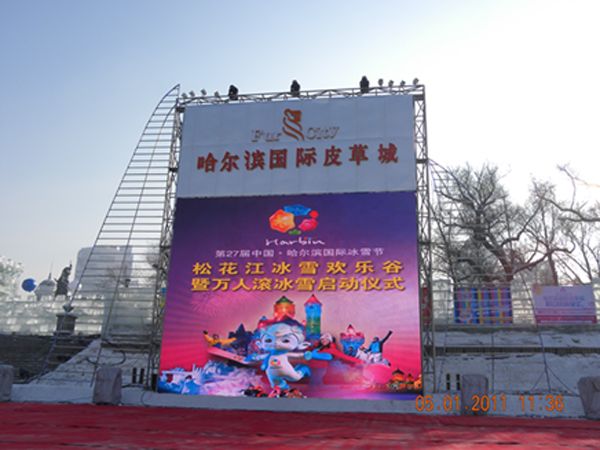 哈爾濱2011冰雪節戶外全彩LED顯示屏大屏幕顯示系統”由“深圳市聯合聚創科技發展有限公司”生產,由沈陽火炬公司承建。該戶外全彩LED顯示屏廣告傳媒系統采用了P16規格,LED顯示屏面積139平米,是戶外全彩LED顯示屏在戶外娛樂應用的一個典型工程案例。