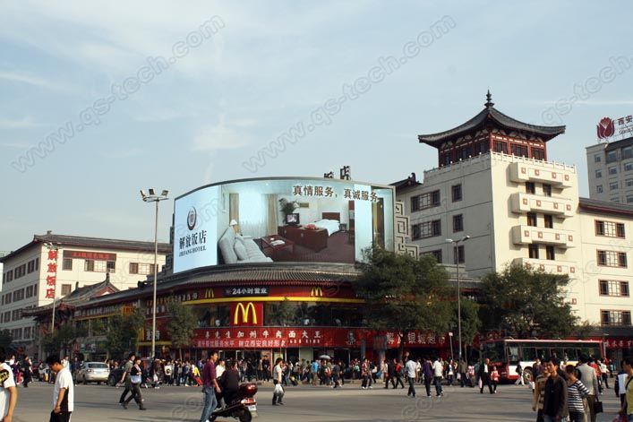 西安市解放飯店弧型戶外全彩LED顯示屏由青松科技承建。該戶外全彩LED顯示屏采用了P20規(guī)格,LED顯示屏面積180.224平米,可視范圍達到190度,屏兩側的仿古造型使電子科技與古典建筑達到了完美的結合,動感的色彩將西安更好的展現(xiàn)在世人面前。
