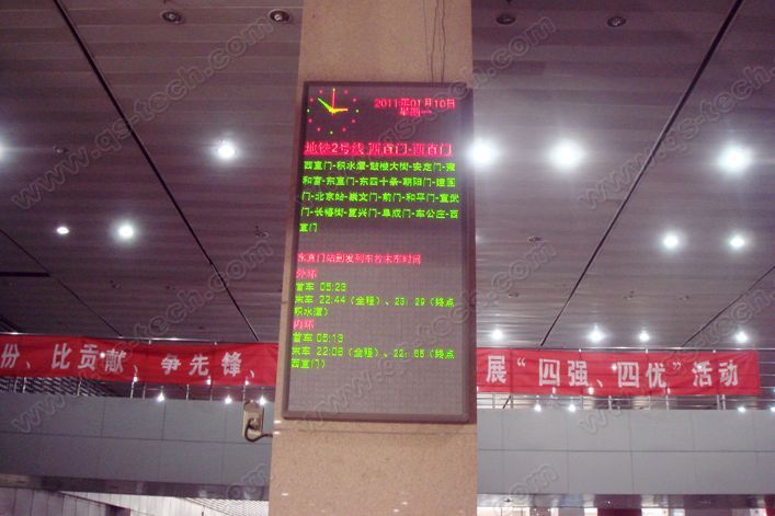 北京東直門交通樞紐交通誘導LED顯示屏系統由青松科技承建。該項目采用了1塊10mm間距戶外全彩顯示屏、1塊6mm間距室內全彩顯示屏及4塊4.76mm間距的室內雙色LED顯示屏產品,合計6塊,總面積達42平米。分別安裝在東直門東南西北四個交通入口及滾梯處,總面積達42平米,能夠充分滿足北京東直門交通樞紐交通信息發布的需要,是交通誘導LED顯示屏在交通誘導應用的一個經典工程案例。