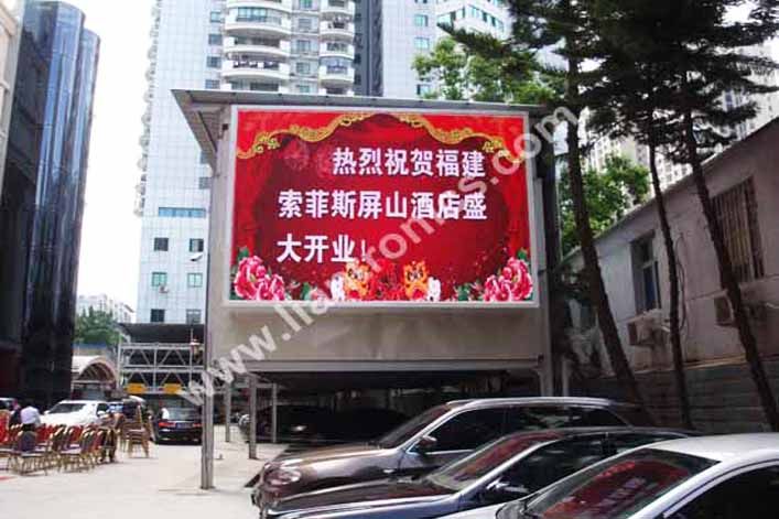 開業當日,除了酒店豪華的裝修、熱情的服務、來往的賓客,最引人矚目的便是立在酒店大門右側的戶外全彩LED顯示屏。