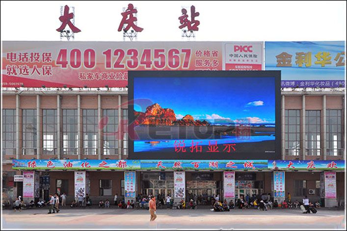 大慶站大屏幕項目規格為16mm點間距戶外全彩LED顯示屏,銳拓標準箱體,總面積165.888平方米;整屏采用低電壓掃描驅動,具有壽命長、成本低、視角廣、視距遠、色彩圖案變化豐富、動態實時響應速度快等優點。銳拓標準箱體經過10多年的升級完善,現已非常成熟,箱體任意拼接,整屏觀看不會任何縫隙,且整屏平整度極好,箱體拼接處平整度誤差不超過0.02mm。