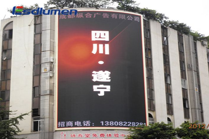 此屏是四川遂寧最大戶外顯示屏,也是目前我司西南區最大戶外顯示屏,其色彩豐富;亮度高,刷新高。使客戶非常滿意,行人經常住足觀看。