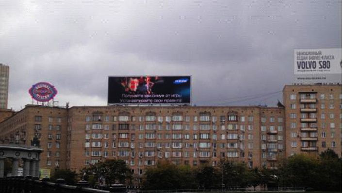 該屏位于莫斯科政治經(jīng)濟(jì)的中心地帶,緊鄰莫斯科河與俄羅斯外交部大樓,面朝莫斯科市區(qū)最大的購物中心Europcentre及人流量最大的基輔火車站,該屏是目前為止莫斯科中心區(qū)最大的戶外廣告屏。