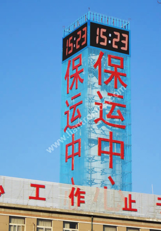 該項目由四塊全彩LED顯示屏組成,呈“口”字形包圍著燕山石化內保利中心的塔頂,相對的兩塊屏面積一致,屏一:9.92*4.96=49.203平方*2套,屏二:8.96*4.96=44.442平方*2套,規(guī)格均為PH20mm。屏幕安裝在高約50m的塔頂,主要用來顯示時間和實時氣溫,由于位置高且360度包圍,故可是距離可輻射整個工廠。