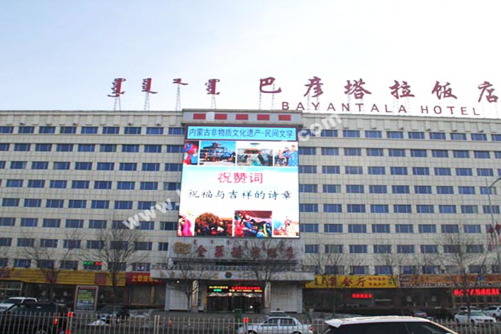 作為呼和浩特市知名的老牌飯店,為了在競爭日益激烈的飯店行業(yè)站穩(wěn)跟腳,巴彥塔拉酒店攜手聯建光電打造了一塊規(guī)格為PH16mm,面積約284平方米的大型戶外LED顯示屏。屏幕安裝在飯店正門上方的幕墻上,直面人車量川流不息的錫林北路,屏幕造型大氣挺拔,足有六層樓高,從飯店大門抬頭望去,傾瀉而下的屏幕宛如一幅炫動的畫卷。