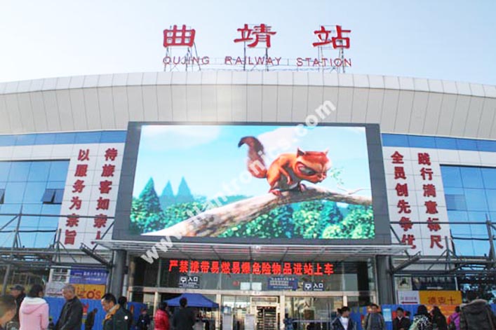 該屏幕安裝于曲靖火車站入站口大門上方,最直觀的面對來往人群,10mm的點間距以及超廣的視角能獲得完美的視覺享受——高清、靚麗、流暢。屏幕能用來播放最新車次信息、城市形象片、商業廣告等,優越的安裝位置、巨大的人員流動量以及高質的顯示效果,相信該屏幕定能在短期內回收成本并收益。