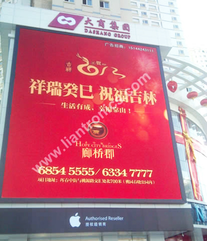 該屏幕安裝于大商集團吉林市新瑪特總店,規格為PH16mm,面積為204.472平方米,安裝于新瑪特總店蘋果旗艦店上方的幕墻上。聯建光電以一流的品質、優良的服務很快完成了該項目的安裝調試,使該屏幕在2013年春節前夕順利點亮,為蛇年的到來添喜喝彩,點亮后的屏體高亮度、高清晰度、視角大、視距廣等一系列優勢,可用于各種高清廣告視頻、圖文的播放,視覺沖擊力極強。