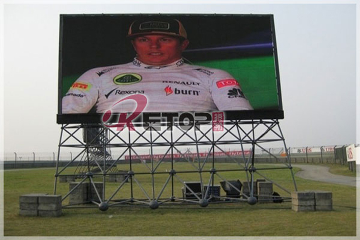 4月12日至14日,2013年F1上海大獎賽在上海國際賽車場舉行。銳拓顯示為F1大獎賽提供了P10的戶外全彩LED顯示屏系列解決方案,總面積近150m2 。屏幕分布于賽場各個看臺的最佳視角處,保證了現場觀眾不僅能感受熱烈氣氛,更不錯過精彩瞬間。比賽場地面平坦,支撐屏幕的鋼結構立于草坪之上,對屏幕的平整度和受力都是極大的挑戰。