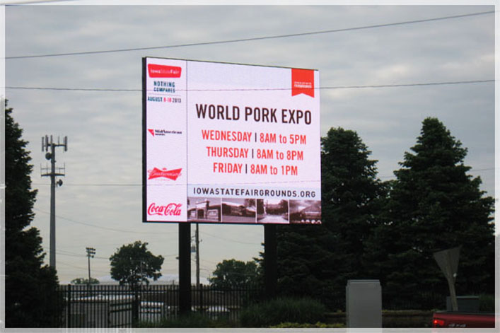 銳拓顯示為美國愛荷華州立會展中心安裝的16mm戶外LED顯示屏成功點亮,該屏幕以畫面細膩,色彩亮麗獲得廣告商和受眾好評。愛荷華州立會展中心建于1854年,總占地面積約1,800,000平方米,這里有世界著名的黃油奶牛雕刻展覽,約為40,468平方米的游樂場和雙摩天輪,還有世界上最大的畜牧展,美國最大的藝術表演等,每年都吸引成千上萬的游客和參展商。此次銳拓顯示提供的16mm戶外LED顯示屏面積為75.17平方米,安裝于會展中心外,用于播放展會廣告信息內容。