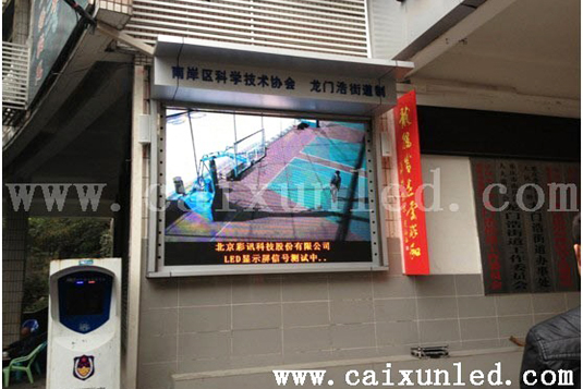 龍門浩街道辦事處放屏的位置是在辦公樓的通道旁,跟傳統的宣傳通欄類似,稍有一點遮擋物;且居民都屬于近距離觀看,要求大屏顯示畫面更加細膩清晰,適合近 距離觀看。綜合這兩點因素,彩訊科技用最佳觀看距離≥4米的P4屏,再加上戶外LED全彩屏的超高防護技術來打造這塊通欄。全屏面積是5個多平方,彩訊科 技因地制宜,使P4全彩屏突破了僅限于室內使用的慣例,使這個項目成為了P4全彩打造的戶外全彩屏的經典案例。