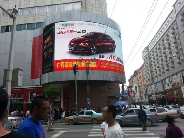 長春桂林路商業街弧形LED顯示屏P16 120平米,桂林路是長春市最繁華的購物街道,廣告位置價格高且不易審批,此塊LED顯示屏更是坐落在該地中心唯一的LED顯示屏,穩定的顯示效果為客戶帶來很好的收益。