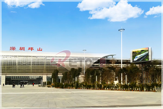 銳拓顯示此次LED顯示屏項目在坪山高鐵站正門廣場兩側安裝四組三面立柱屏,采用P10戶外LED全彩顯示屏,每塊約22㎡,總面積265.42㎡。單立 柱結構,觀眾可在廣場上任意角度清晰地觀看到LED顯示屏上的公示信息,信息傳達效率極高。項目預留安裝時間極短,應官方要求,要在27日晚9點開始安 裝, 至28日上午9點前必須完成安裝調試工作。
