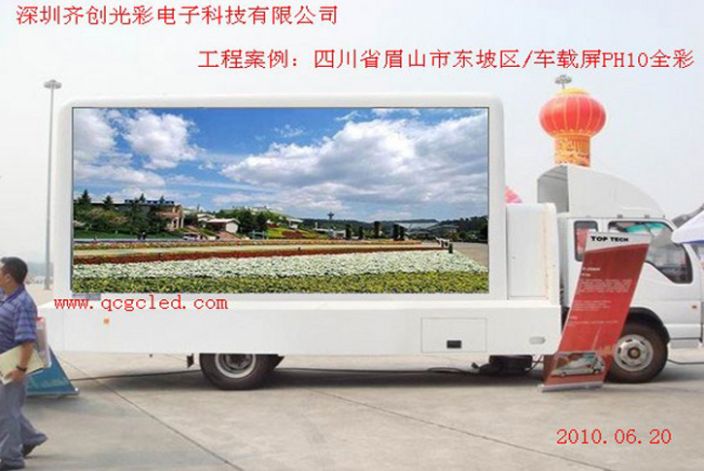 四川眉山東坡區車載戶外全彩LED顯示屏大屏幕顯示系統由深圳市齊創光彩電子科技有限公司承建。該戶外全彩LED顯示屏信息發布系統采用了P10規格,LED顯示屏面積9.6平米,成為四川眉山東坡區信息發布的重要平臺。