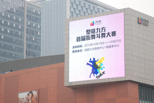 此顯示屏是由利亞德光電股份有限公司在成都中航商業廣場九方購物中心調試成功,該戶外全彩LED顯示屏廣告傳媒系統采用了P16規格,LED顯示屏面積為375.7平米。