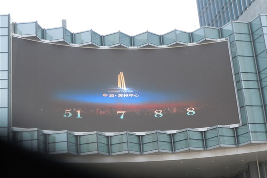 蘇州中潤廣場戶外全彩LED顯示屏,采用P10、165.53平方米弧形顯示屏。該產品用進口大功率管芯亮度高、衰減小、壽命,滿足戶外陽光直射條件下清晰顯示要求;屏體表面平整,色彩均勻、對比度高、真實還原畫面色彩;