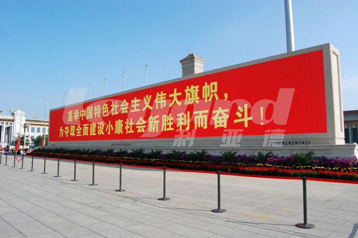 “北京天安門廣場英雄紀念碑信息發布戶外LED顯示屏大屏幕顯示系統”由利亞德光電股份有限公司承建。該戶外全彩LED顯示屏信息發布系統采用了P12規格,LED顯示屏面積200平米,成為北京天安門廣場英雄紀念碑信息發布的重要平臺,是戶外全彩LED顯示屏在政府機關信息發布應用的一個經典工程案例。