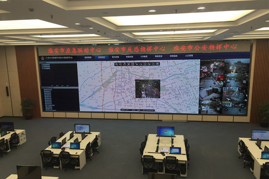 淮安市公安局綜合應急指揮中心采用利亞德TW1.45小間距高清LED顯示墻作為信息顯示核心平臺,物理尺寸為16.8m*4.725m,面積達到79.38㎡,整屏像素分辨率達到11550*3248,此分辨率對于顯示效果及軟、硬件設備均提出了非常高的要求。