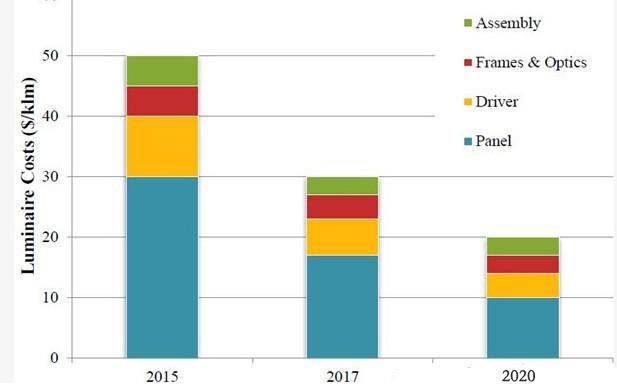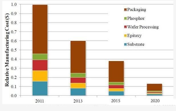 討論集中在LED封裝制造工藝和使用成本較低的材料,具體而言,從2012年封裝LED吞吐量每年增加2倍,每2~3年減少50%的裝配成本(cost/klm)、每2~3年減少50%的包裝成本($/平方毫米)、每2~3年每包成本($/klm)減少50%。