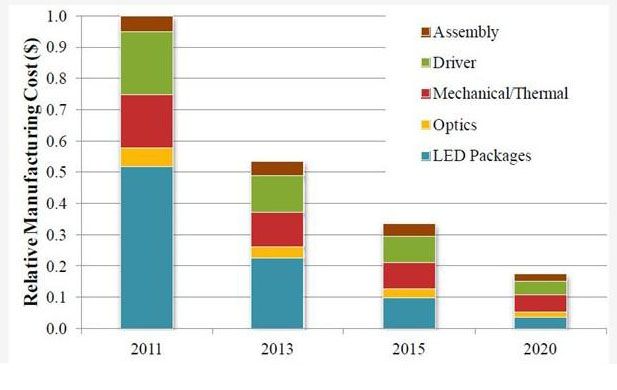到2015年的具體目標包括每年增加2倍的吞吐量,減少OEM燈泡價格(從$ 50/klm 降級至$ 10/klm),每2~3年減少50%的裝配成本,改善色彩控制(從7 SDCM至4 SDCM)。