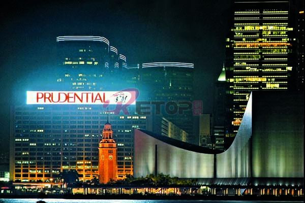 銳拓為英國最大的保險集團 – 保誠(Prudential)打造樓頂巨型高清顯示屏,總面積達到586平米。顯示屏于2007年安裝,至今已有5年,24/7小時播放保誠廣告,至今仍然良好運作。保誠顯示屏位于香港星光大道中行,背靠九龍,面對香港島,由于其顯示屏效果突出、面積巨大,全天候播放高清視頻廣告,成為維多利亞港的焦點和星光大道的地標。