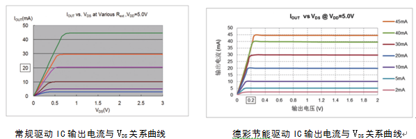 為保證整屏的一致性,則驅動芯片的輸出電流必須一致,不過其輸出電流的線性特性與輸出通道的電壓有極大關聯。在特定的輸出電流下,只有當輸出通道電壓大于某個值,才能保證恒流輸出。常規的驅動芯片為保證輸出電流進入恒流區,轉折電壓在 0.5V 左右。德彩G系列選用的驅動IC輸出通道電壓大于 0.2V,就可以保證恒定的電流輸出。